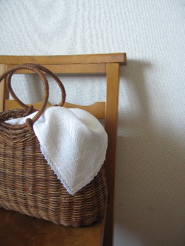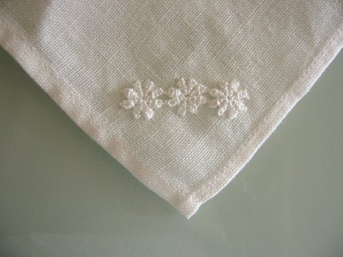 40×40のリネンの角に レース編みをして フォーサイドステッチ
